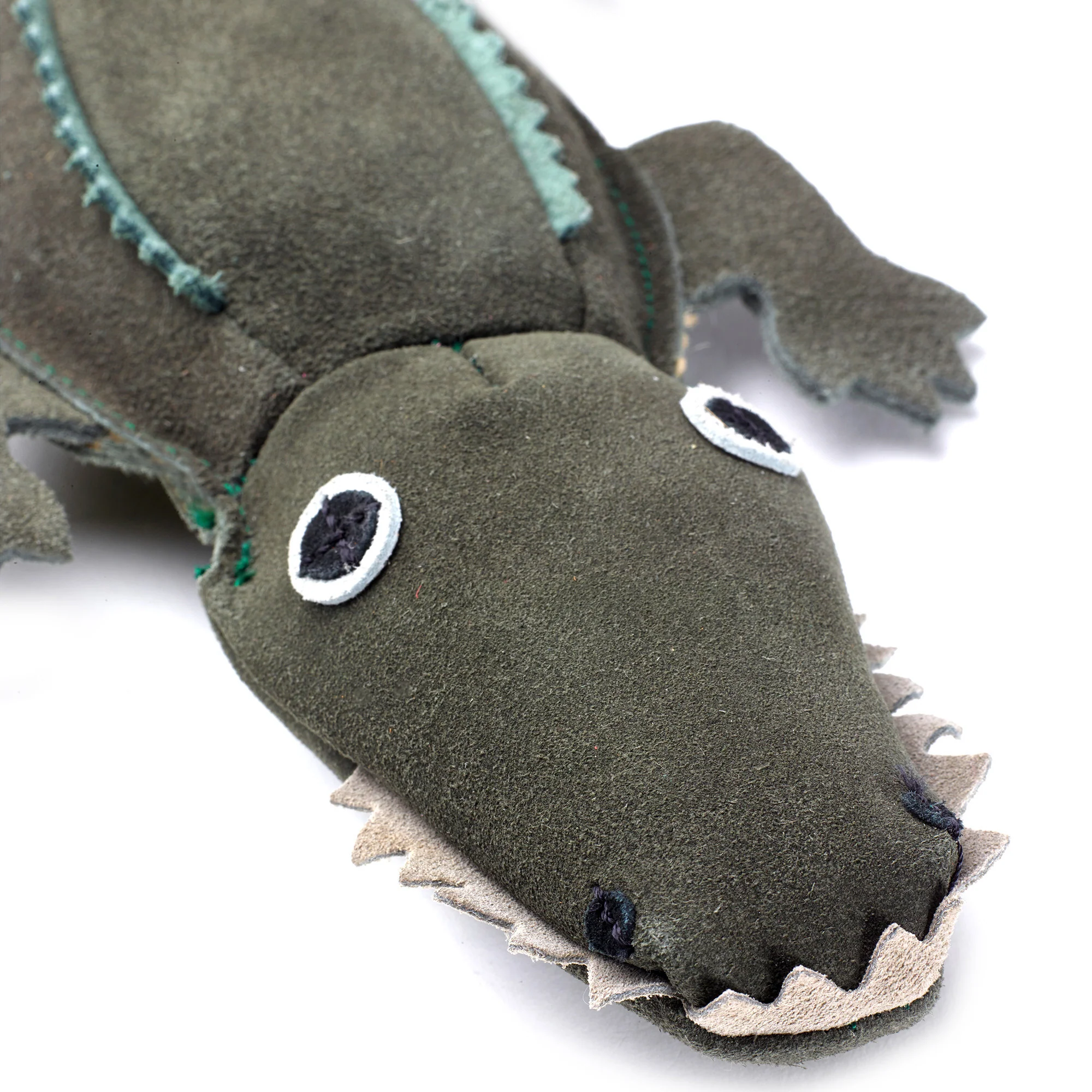 Colin the crocodile has a suede outer layer covering a filling of natural jute fibres. Jute is a natural, sustainable plant fibre. The suede is a by-product and ensures that this material is not wasted.
